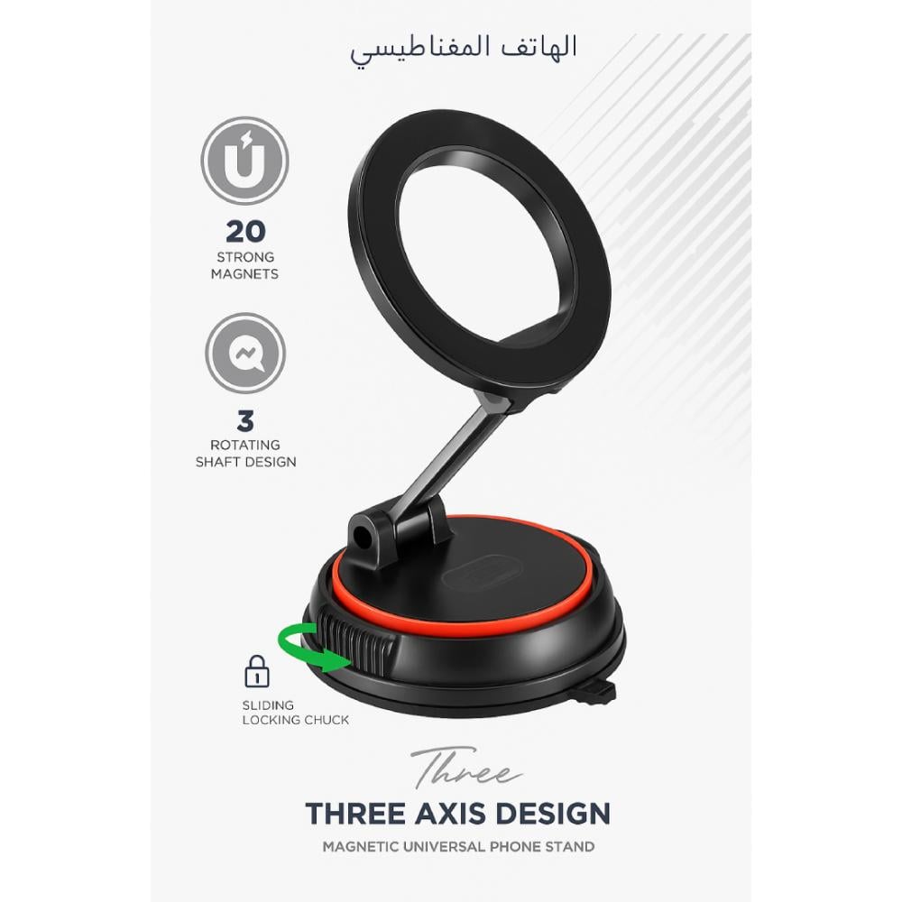 - يبرز منه ذراع قابل للطي ينتهي بحلقة دائرية سوداء، وهي المنطقة التي يلتصق بها الهاتف مغناطيسيًا (أو يمكن استخدامها كمسند).